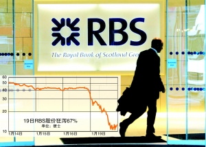 周一倫敦市場,RBS股價狂瀉67%,創(chuàng)20多年來最大單日跌幅,股價最低跌至僅為10便士,為至少25年來最低點。