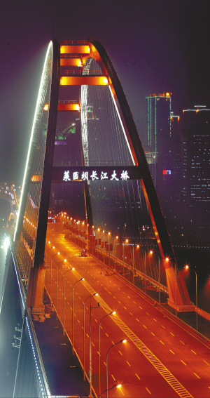 菜園壩長江大橋創(chuàng)下了三項世界第一:鋼箱拱梁跨距420米,為世界第一長;是世界第一座公路輕軌兩用城市大橋;也是世界第一座采用纜索吊機安裝的大橋。