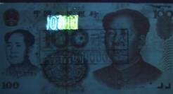 假鈔用紙均為一般社會(huì)化用紙,不含棉纖維,光滑、綿軟、無(wú)韌性、偏厚,抖動(dòng)或用手彈時(shí)聲音發(fā)悶。在紫外光下一般有熒光反應(yīng)(見(jiàn)下圖)。