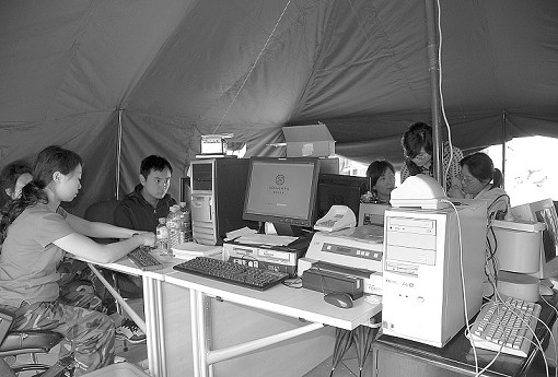 “這里是都江堰第一個(gè)帳篷銀行,同時(shí)也是第一臺(tái)恢復(fù)運(yùn)行的ATM取款機(jī)。”臨時(shí)設(shè)立應(yīng)急業(yè)務(wù)辦理點(diǎn)運(yùn)行組的張蓉向記者介紹,5月14日下午,在當(dāng)?shù)厮薪鹑跈C(jī)構(gòu)都因地震受損嚴(yán)重停業(yè)的情況下,工行都江堰支行決定設(shè)立臨時(shí)的應(yīng)急業(yè)務(wù)服務(wù)點(diǎn),為市民提供金融服務(wù)。