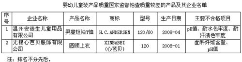 抽查結(jié)果表明,一是此次抽查嬰幼兒童裝產(chǎn)品的甲醛含量、可分解芳香胺染料、異味、耐唾液色牢度及產(chǎn)品標識等項目單項符合率達到100%。二是市場占有率較高的大型生產(chǎn)企業(yè)產(chǎn)品質(zhì)量較好,所檢項目全部符合國家標準規(guī)定的要求。