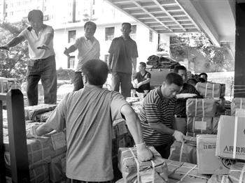 工作人員正在向災區(qū)發(fā)運教材。 本報記者 王立強 攝