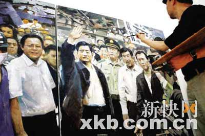 昨日,記者在作畫現(xiàn)場看到很多熟悉的畫面,有《敬禮娃娃》、《握筆的手》……而在《地劫·重生》長卷上還驚喜地發(fā)現(xiàn),有一組創(chuàng)作正是取材于本報特派四川記者李潔軍、王小明的一幅攝影作品,該新聞圖片攝于5月16日上午,畫面凝固的是當(dāng)時胡錦濤總書記來到四川地震災(zāi)區(qū)北川羌族自治縣,向當(dāng)?shù)厝罕姾蛽岆U武警官兵揮手慰問的瞬間。 (記者 陳琦鈿 實習(xí)生 李淑子)