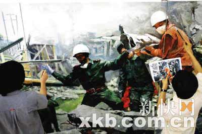 “而我認(rèn)為,這次是賑災(zāi)作畫,大家應(yīng)該用愛心去畫,而不是去強(qiáng)調(diào)每個人的繪畫個性。只要你愿意做,藝術(shù)風(fēng)格是可以磨合的,當(dāng)然這需要一股非常強(qiáng)大的推動力去促使大家這么做……”陳鏗用了整整一個晚上,把1千多張發(fā)自災(zāi)區(qū)的圖片報道翻了個遍,之后從中選擇出幾十張非常具有代表意義的“瞬間”,重新組合成三組震撼人心的畫面,《地劫》、《拯救》、《重生》。
