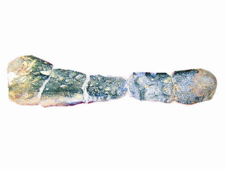目前,已挖掘出土的化石有股骨、趾骨、和一些關(guān)節(jié)骨頭,已收集骨頭30多塊。還有部分骨化石包裹在巖石里面,株洲市文物局已運(yùn)回兩車巖石,將對(duì)其進(jìn)行切割、清理。考古人員將恐龍化石的趾骨、股骨拼湊起來,經(jīng)測(cè)量趾骨約20厘米,股骨長約77厘米,接近屁股段的股骨化石寬約22厘米,考古專家推測(cè)其腿部高在2米以上,據(jù)此可推斷是巨型恐龍。