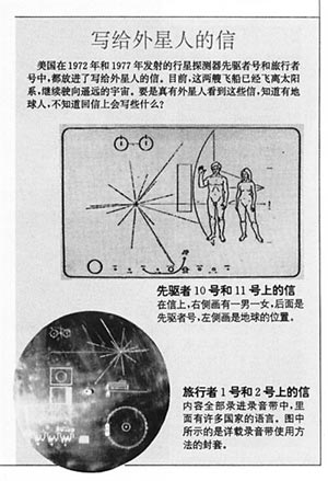 這種名片被認(rèn)為是一種與外星人進(jìn)行直接溝通的方法。在名片上,人類以圖畫的形式表示出了太陽系、地球所在的位置、男人和女人的形象。人們希望當(dāng)探測器在飛出太陽系后萬一被什么外星智慧拾獲,會發(fā)現(xiàn)我們的存在。
