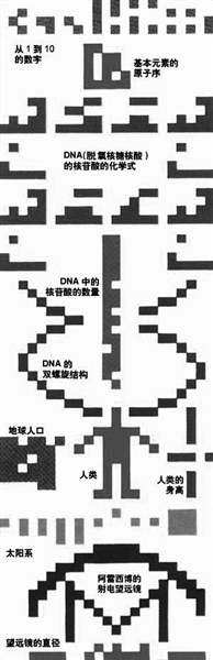 1974年11月16日下午,位于波多黎各的大型射電望遠(yuǎn)鏡向武仙座方向發(fā)送一個給外星人的信號,這個信號持續(xù)3分鐘。信息中以符號的形式描述了1~10的數(shù)字、太陽系、地球和人類的DNA。這條信號以光速飛向25000光年以外的一個星團(tuán)。也就是說,假如那里有外星人收悉我們的信號,然后再給我們作出回復(fù)的話,我們會在5萬年后收到它。