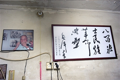 王家將靈堂設(shè)在老人臥室之中,不大的臥室里擺放著網(wǎng)友送來(lái)的花圈,挽聯(lián)上寫(xiě)著“沉痛悼念抗日英雄王文川先生”。老人的遺像安放在靈堂正中,遺像中的老人戴著眼鏡神態(tài)安詳,遺像前擺放著老人生前佩戴的手表和一把上海牌口琴。