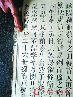 記者在這部由“同文堂字林書局”印制的族譜起初看到了這樣的記載:“先源于曹彬二十六世孫,南京避亂,世居北京真定府。迄宋之末,公達(dá)祖者因鄉(xiāng)科釋褐,后任選信豐縣正堂……”
