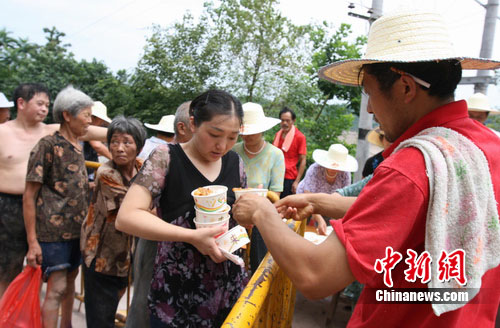 在肖溪鎮(zhèn)民國新街,盒飯供應(yīng)處也喂?jié)M了人,菜飯飄香。“我們這個安置點的災(zāi)民共有200多人,全部住在老百姓家里,吃飯由政府統(tǒng)一解決。還設(shè)立了開水集中供應(yīng)點,方便群眾解渴!