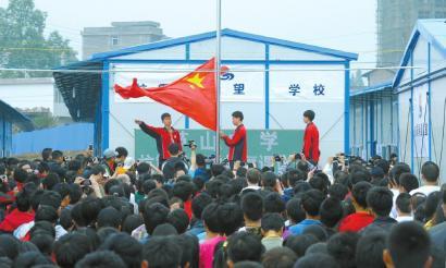 昨日上午10時(shí)許,復(fù)課儀式在蘆山中學(xué)操場(chǎng)上舉行。唱國歌、升國旗、宣布復(fù)課……1500余名蘆山中學(xué)高一、高二年級(jí)師生,近百名志愿者,希望工程捐贈(zèng)方代表……所有的空地都被人群占滿。