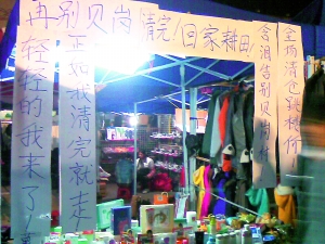只見高高掛著的白色橫幅“再別貝崗,清完回家耕田”幾個字格外醒目,再加上“輕輕的我來了,正如我清完就走”、“含淚告別貝崗村,全場清倉跳樓價”兩幅對聯(lián)。而“靈堂”下的“祭品”卻是各種名牌護膚品。對此,不少人學生表示很迷惑:“怎么是白色對聯(lián)呀,應該用紅色才對吧?”隔壁攤位的老板極盡挖苦地說:“好像死了一家人,等著些錢買棺材似的!倍摗办`堂”的“堂主”,竟是來自華工的高才生,“因為沒有機會外出去實習,我們就通過這樣的方式來磨練自己。我們的樣子都這么慘了,大家一動心就會買的。”兩個男生強調,做市場營銷這一行,需要承受很多異樣的目光和心理壓力,這對他們來說是極大的鍛煉。