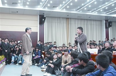 面對學(xué)生提問,李培根表示,學(xué)校處于高速發(fā)展期,引進的許多重大科研項目都需要錢;人文氛圍的營造不容小視,但硬件暫時落后,“要克服一下”。“咱們學(xué)校的行政樓,在中國很難找到比它更差的!彼p輕說,同學(xué)們報以掌聲。2個多小時的見面會,李培根站著回答問題。 (記者 李佳)