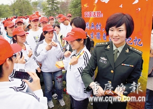 為讓學(xué)子們感受當(dāng)兵的光榮,市征兵辦還請來三位“形象大使”現(xiàn)場宣傳。她們是三醫(yī)大的唐甜和楊菁,以及重慶警備區(qū)女戰(zhàn)士唐勇。唐甜和楊菁是國慶閱兵式上女兵方陣的一員,她們在閱兵式上的颯爽英姿讓人記憶猶新。而18歲的唐勇雖去年才入伍,但已榮立二等功。