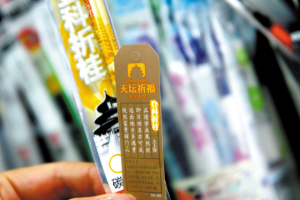 “這款狀元筆買的人很多,大家都希望能高中狀元,上次一個(gè)家長就買了10支”。昨天下午,省城長江路上一家文具店內(nèi)店家向顧客介紹。記者抽取了一款外包裝印有“登科折桂”字樣的中性筆筆芯,打開后里面竟然還附帶一張小卡片,卡片上寫有“上上簽”、“天壇祈福”等大吉大利的語句(如圖)。店家王女士告訴記者,這種“討彩”文具是今年才大量出現(xiàn)的,賣得非常好,有的學(xué)生和家長還專門前來購買。“其實(shí)大家也都是種心理暗示,圖個(gè)吉利,商家正好抓住了消費(fèi)者的心理”王女士說。