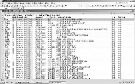 打開這個(gè)公示名單,前兩行的內(nèi)容分別是:“許鑫;性別:男;報(bào)名序號(hào):13103003;地區(qū):杭州市淳安;所在中學(xué):淳安中學(xué);二級(jí)證書:射擊;二級(jí)證書競(jìng)賽名稱:2007年浙江省中小學(xué)生射擊錦標(biāo)賽;等級(jí):省級(jí);認(rèn)定結(jié)果:合格”。