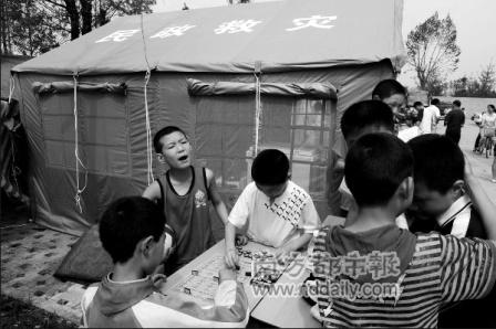 車還沒進(jìn)聚源小學(xué),谷勝聰奔下小巴,直沖校內(nèi)。這里是小學(xué)和初中一年級(jí)的臨時(shí)教室所在。昨天是初一年級(jí)的學(xué)生地震災(zāi)難后第一天復(fù)課,由于初一教學(xué)樓是原來(lái)的小學(xué)教學(xué)樓,與中學(xué)教學(xué)樓相距數(shù)公里,初一的學(xué)生毫發(fā)無(wú)損。遇難的學(xué)生全部是集中在坍塌的初中教學(xué)樓本部的,是初二、初三的學(xué)生。