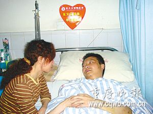 地震被埋的北川中學(xué)教師楊漢德,病床上一直自責(zé)沒能參與搶救自己的學(xué)生。“到醫(yī)院兩天了,他一直不愿說話!弊蛳挛纾鹘坚t(yī)院外二科病房,院長陳和平為傷員楊漢德遞上了慰問金,守候在病床前的妻子張鈺,看著表情木然的楊漢德,也不禁黯然神傷。
