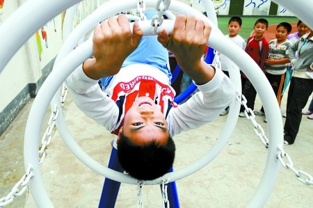 五年級的小學(xué)生徐成林排隊(duì)坐在一個(gè)名叫“過山環(huán)梯”的器材上,面朝上躺下,然后憑著手和腳的力量在環(huán)形的器材里,像只小蟲一樣蠕動(dòng)前進(jìn)。