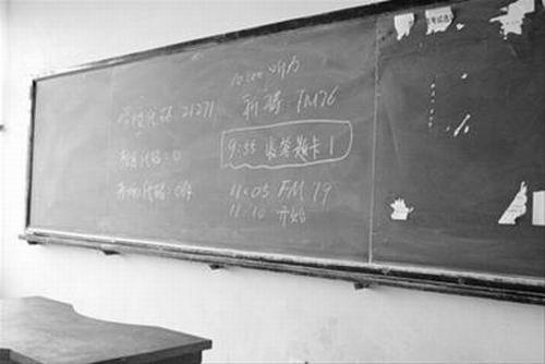 記者在第二教學(xué)樓208教室的黑板上看到兩個(gè)顏色書寫的內(nèi)容,白色粉筆寫著“聽力10:00 FM76”,黃色粉筆寫著“11:05 FM79”。