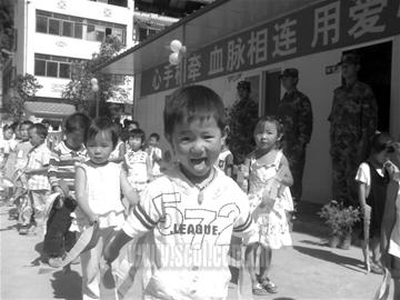 5·12地震時(shí),龍門山鎮(zhèn)幼兒園100多名孩子正在幼兒園午睡,5名老師冒著生命危險(xiǎn)將他們?nèi)繐屃顺鰜?lái),但校舍卻成了危房!霸倏嗖荒芸嗪⒆!”在龍門山鎮(zhèn)參加救援的廣州空軍官兵知道后,立即著手為孩子們重建樂(lè)園。