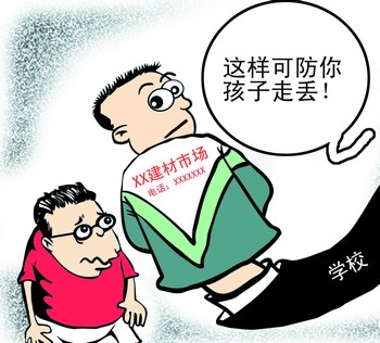 近日,杭州下沙金沙學(xué)校學(xué)生穿上了新校服,校服是家長(zhǎng)掏錢買的,校服背后寫著大大的“杭州恒大建材市場(chǎng)”幾個(gè)字,還留了電話號(hào)碼。校長(zhǎng)解釋稱,之所以印這個(gè),一是為了防學(xué)生走丟,二是為了感謝建材市場(chǎng)對(duì)學(xué)校工作的支持,電話號(hào)碼是校長(zhǎng)辦公室的。(10月29日《都市快報(bào)》)