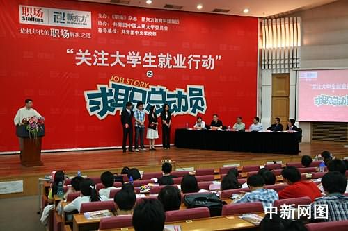 中新網(wǎng)北京5月9日電 共青團(tuán)中央學(xué)校部指導(dǎo)、新東方教育科技集團(tuán)和《職場(chǎng)》雜志聯(lián)合推出的“求職總動(dòng)員”活動(dòng)今天在中國(guó)人民大學(xué)啟動(dòng),這次活動(dòng)將充分發(fā)揮團(tuán)組織、教育機(jī)構(gòu)和媒體的不同作用,攜手知名企業(yè)、職場(chǎng)咨詢團(tuán)走入十所城市、十座大學(xué),把實(shí)習(xí)、就業(yè)的機(jī)會(huì)和求職秘籍帶給即將畢業(yè)的大學(xué)生,并提供2000余個(gè)實(shí)習(xí)機(jī)會(huì),幫助更多的大學(xué)生找到心儀的工作。