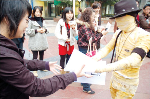 扮“木乃伊”路邊發(fā)簡歷
