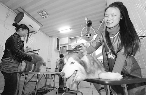 3月31日,寵物美容店店主徐曉娟(右)在為客人的寵物狗美容。2004年,貴州大學(xué)經(jīng)濟(jì)貿(mào)易系的徐曉娟大學(xué)畢業(yè)后選擇自主創(chuàng)業(yè)。她在貴陽市開辦了一家名為“千寵萬愛”的專業(yè)寵物美容店,由于服務(wù)專業(yè)、管理得當(dāng),生意一直不錯,月收入近萬元。她的寵物美容店也成為大中專畢業(yè)生的實習(xí)場所,先后有20多位畢業(yè)生來此打工或?qū)W習(xí)。