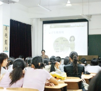 昨晚7點,在該校一間可容納90人的大教室里已坐滿了女生,有的正認真做著筆記,有的與同伴小聲交談著。講臺上,女教師在介紹該課的主要內容,包括女子生殖系統(tǒng)、避孕、婦科病等知識。
