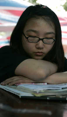 書是從廢墟中和同學(xué)處湊出來的,書桌是從帳篷鄰居那兒借來的。張亞秋理解廣播里傳出災(zāi)區(qū)消息的巨大聲音,也理解來來往往為賑災(zāi)的車輛,她只是每天抓緊僅有的時(shí)間,盡力讓自己沉浸到復(fù)習(xí)環(huán)境中去。“以前每天七點(diǎn)半開始早自習(xí),晚上復(fù)習(xí)到11點(diǎn),現(xiàn)在6點(diǎn)鐘就起床,下午4點(diǎn)左右就不能看書了!睆垇喦镎f,下午4點(diǎn)以后,天色變化很快,光線已經(jīng)不能再看書。