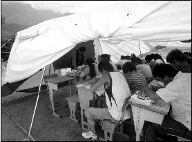 昨天下午,茂縣中學(xué)操場(chǎng)上架起了8個(gè)巨大的白色帳篷,帳篷上印有聯(lián)合國(guó)兒童基金會(huì)的藍(lán)色標(biāo)志。每頂帳篷里都坐滿了高三學(xué)生。為了散熱,帳篷兩側(cè)都被撩起來(lái)通風(fēng)。4點(diǎn)剛過(guò),喧鬧的帳篷內(nèi)頓時(shí)安靜下來(lái),其中一個(gè)帳篷里不久后傳出了一片讀書(shū)聲。旁邊的“教室”內(nèi)學(xué)生們安靜地做著卷子。記者悄聲問(wèn)坐在帳篷邊的一位女生上什么課,她悄聲回答:“地理!