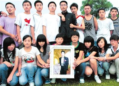 在孩子們排成兩行的弧形隊(duì)列里,居于中心位置的是一個(gè)很特別的“老師”,“他”不是一個(gè)有血有肉的人,而是一個(gè)彩色畫(huà)框。畫(huà)框里,身材頎長(zhǎng)的他,打著領(lǐng)結(jié),戴著眼鏡,笑意盈盈,神采飛揚(yáng)。他叫何海平,是這個(gè)完整存活下來(lái)的北川中學(xué)初三(4)班的班主任、英語(yǔ)教師。而今,他的學(xué)生們一個(gè)個(gè)都還活蹦亂跳的,他卻永遠(yuǎn)地走了。