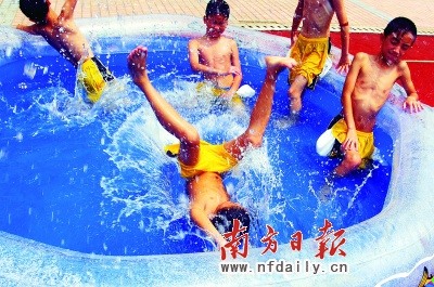 開學當天,“汶川班”學生下課后,在充氣型游泳池里玩得不亦樂乎。