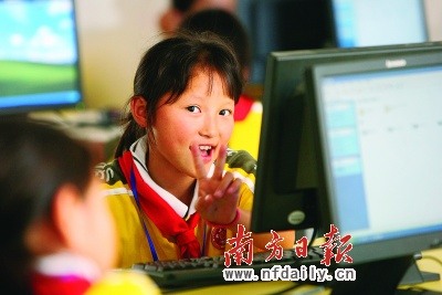 一名學生在上電腦課時,調(diào)皮地沖著記者做手勢。