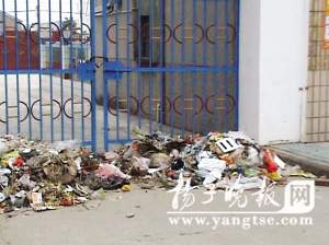 幼兒園大門前堆滿了垃圾。