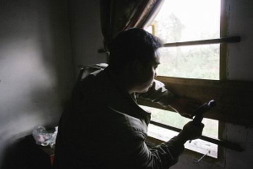 小坤的二伯將窗戶釘上 記者 陳藝豐 攝