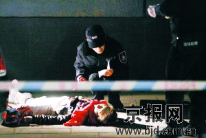 在事發(fā)現(xiàn)場,小穎倒在了一輛黑色雪鐵龍轎車的旁邊,散開的黑色外套里,依稀能看見左前胸的一片殷紅,黑色手包和已經(jīng)辨不出顏色的圍巾就在她的身旁。而一把十幾厘米長的水果刀還放在小峰倒下的位置。小穎的尸體旁邊,警方正在進行現(xiàn)場勘查。