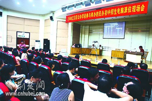 輕點(diǎn)鼠標(biāo),投影屏幕上一道綠色的橫線(xiàn)不停地跳動(dòng),一個(gè)個(gè)學(xué)生名單隨之產(chǎn)生……昨日上午,武漢市15所改制初中轉(zhuǎn)為民辦學(xué)校后,首次舉行“小升初”擇校生電腦派位。