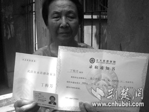 丁老太告訴記者,她出生于1932年,從未參加過高考,收到該通知書時(shí),一看見“北大”二字,她受寵若驚。