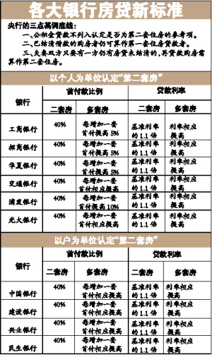 認(rèn)定第二套住房,關(guān)鍵是看計(jì)算單位是家庭還是個(gè)人。在這方面,四大銀行和其他商業(yè)銀行及分支機(jī)構(gòu)已經(jīng)出現(xiàn)分歧。央行正聯(lián)合四大商業(yè)銀行討論房貸“第二套房”的核定標(biāo)準(zhǔn),預(yù)計(jì)近日將確立統(tǒng)一的“第二套房”認(rèn)定標(biāo)準(zhǔn)。中國建設(shè)銀行已經(jīng)明確了“第二套房”的認(rèn)定標(biāo)準(zhǔn)是以“戶”為單位。不出意外的話,這也將是其他三大商業(yè)銀行的選擇。目前華夏、光大等銀行則以個(gè)人為單位界定第二套房。