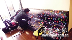 吳女士的家墻壁是在墻體進行人工手繪。與用墻紙、乳膠漆相比,手繪墻畫不僅不會掉色,而且很便宜。吳女士家,四幅墻畫和沙發(fā)手繪,一共不到6000元。(記者 陳寒星)