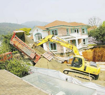 之江中隊(duì)的王盛隊(duì)長(zhǎng)告訴記者,從2007年開始,九溪玫瑰園內(nèi)擅自挖地下室開始出現(xiàn)。至今為止,共有22幢別墅擅自挖地下室,但昨天強(qiáng)制回填的那戶面積最大!叭ツ9月已強(qiáng)制回填了一個(gè)地下室,面積大約180平方米;后天還要再強(qiáng)制回填一個(gè),大概200平方米。其余的,我們也將陸續(xù)強(qiáng)制回填!蓖跏⒄f。