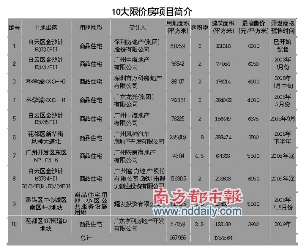 在這10宗限價(jià)房項(xiàng)目中,除了已經(jīng)開售的保利西子灣以外,還有中海地產(chǎn)在金沙洲的金沙馨園和萬科地產(chǎn)在開發(fā)區(qū)的新里程兩個(gè)項(xiàng)目即將在今年1月開售。此外,和萬科新里程項(xiàng)目鄰近的廣東龍光集團(tuán)開發(fā)的限價(jià)房項(xiàng)目有望在今年5月份開售,該項(xiàng)目最高限價(jià)為4000元/平方米。其余限價(jià)房項(xiàng)目有望在今年下半年或年底前開售,而廣東亨利房地產(chǎn)開發(fā)有限公司去年底在花都107國道附近拿下的限價(jià)地要到2009年才能建成銷售。