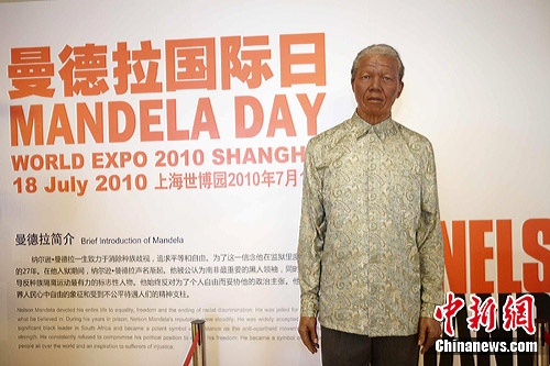 當(dāng)天,一尊來(lái)自上海杜莎夫人蠟像館的曼德拉蠟像“走入”南非館,栩栩如生的造型讓有人覺得仿佛這位“人權(quán)斗士”真的親臨世博園,游客紛紛掏出相機(jī)、駐足與偉人留影。