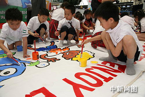 中新網(wǎng)上海6月5日電(蘇巍巍 陳貝)6月5日上午,來(lái)自中、美、法、德等不同國(guó)家和地區(qū)30位小朋友歡聚浦東機(jī)場(chǎng)2號(hào)航站樓,在10米長(zhǎng)卷上描繪世博,在“許愿樹(shù)”上祝福世博。