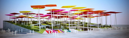 風(fēng)箏廣場是墨西哥館的核心。風(fēng)箏在nahuatl語(民族方言)的名稱是“papalotl”,也就是西班牙語中的蝴蝶。風(fēng)箏是連接墨西哥文化和中國文化的一個要素。參觀者可以在墨西哥館里購買風(fēng)箏,或者親手做一個風(fēng)箏,然后在風(fēng)箏廣場上放飛。由風(fēng)箏組成的森林代表著墨西哥人對未來的期待,廣場上的人造綠草表達了墨西哥人對城市綠地的關(guān)注。人們可以在綠地上進行各種活動,諸如讀書、野餐或是在陰涼處隨意地休憩;綠地上空,風(fēng)箏在飛翔。