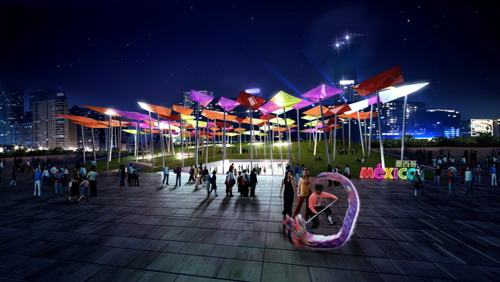 墨西哥館占地面積4000平方米,將展示墨西哥的歷史、文化和夢想。據(jù)墨西哥館相關(guān)負責(zé)人介紹,進入墨西哥館,參觀者就好似開始了一段從史前時代到未來的墨西哥歷史旅程。展覽的第一部分為“回顧過去”,投影到地板上的三個屏幕將分別反映墨西哥史前城市、殖民地城市和19世紀城市的風(fēng)貌;第二部分為“了解現(xiàn)狀”,空間中充滿了不斷運動和投映的元素,代表著城市的現(xiàn)實動態(tài)。在這里,就好像站在現(xiàn)實的窗口前,參觀者能夠看到墨西哥的現(xiàn)狀;第三部分則為“展望未來”,主辦方為參觀者提供了一些互動表格,其中列出了一些信息,用于交流與創(chuàng)設(shè)更好的墨西哥發(fā)展計劃、未來項目以及可持續(xù)環(huán)境計劃。在整個旅程的終點,參觀者將通過一個有三個屏幕的狹小空間,看到位于展廳頂部的風(fēng)箏廣場的實時圖像,圖像將顯示正在廣場進行的活動,隨后參觀者會被邀請登上廣場,成為廣場活動的一部分。
