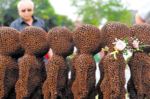世博會建設留下的破銅爛鐵搖身一變,成了承載藝術家奇思妙想、宣傳節(jié)能環(huán)保的“精靈”。昨天(16日),2009年上海國際鋼雕藝術節(jié)拉開帷幕,來自世界各地近百具由廢棄金屬改造的雕塑奪人眼球。前擋板抹上“口紅”,輪胎和車身“穿”上彩色噴漆,報廢鏟車蛻變?yōu)椤澳Φ桥伞薄?table border=0 cellspacing=0 cellpadding=0 align=left>