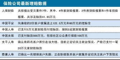 昨日,上海保監(jiān)局向《國際金融報(bào)》記者透露,已經(jīng)在第一時(shí)間啟動(dòng)應(yīng)急預(yù)案,采取緊急措施通過短信平臺向上海市保險(xiǎn)公司發(fā)送保險(xiǎn)排查通知,要求及時(shí)做好理賠工作。目前,太平洋保險(xiǎn)向上海市靜安區(qū)江寧路街道支付的400萬元是最大單筆保險(xiǎn)金。